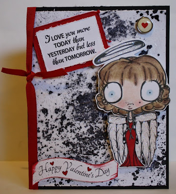 I colored my Octopode angel (that I won last week - thanks Lily!) with Prismacolor pencils & mineral spirits and Prismacolor markers. Her wings and halo are covered in Stampin' Up! Dazzling Diamonds glitter. For the background, I covered a piece of white cardstock with white gel medium, and used a foam brush to create peaks and texture. Once it dried, I sprayed it with Jet Black Smooch Spritz. "Happy Valentine's Day" is a digi stamp from CS Designs - love quote is a digi stamp from TLC. Ribbon and heart brad are from SU!